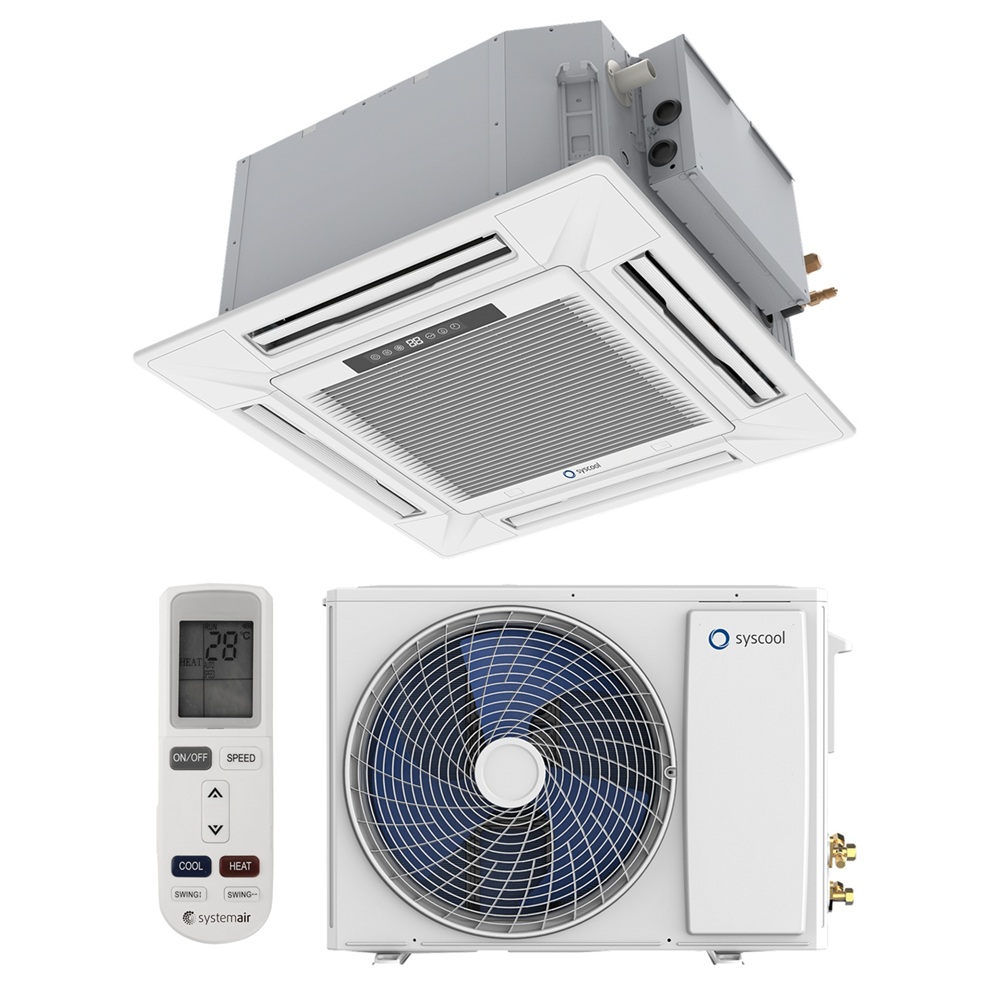 Кассетный кондиционер Syscool CASSETTE 36 EVO HP Q из серии CASSETTE EVO с инверторным управлением предназначен для эффективного кондиционирования и обогрева помещений площадью до 100 м². Модель отличается высокой производительностью 10.55 кВт при охлаждении и 11.7 кВт при обогреве, а также способностью работать в широком диапазоне температур — от -30 °C до +49 °C при охлаждении и от -15 °C до +24 °C при обогреве.